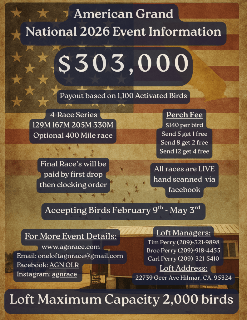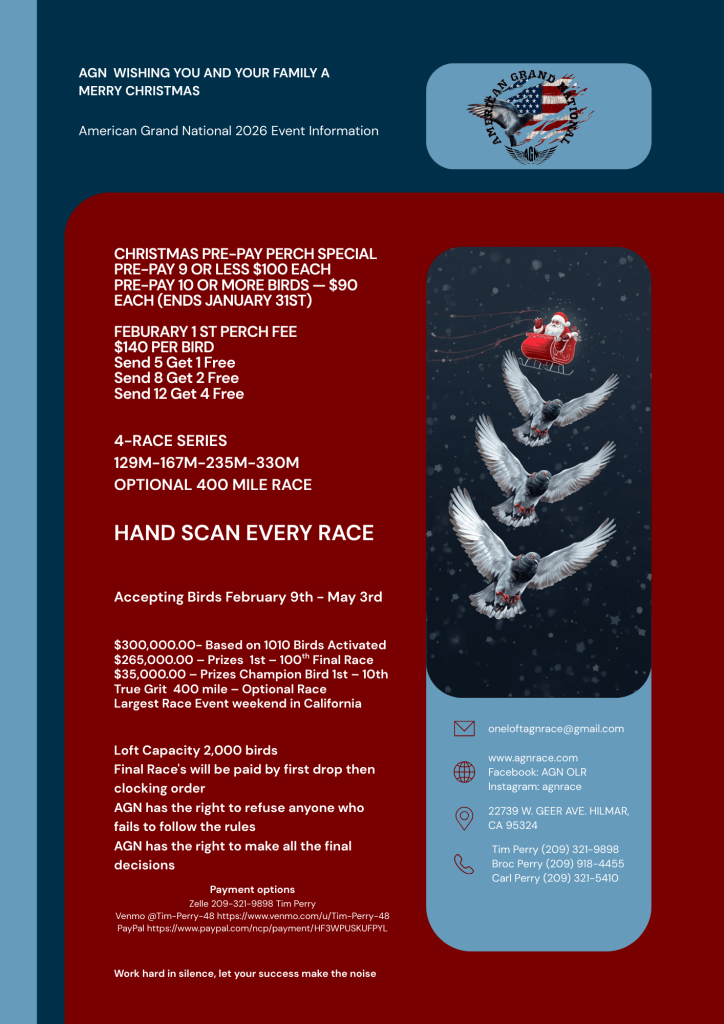 The Perry’s would like to welcome you to our loft. We are a family owned business with over 30 years of experience in racing pigeons.